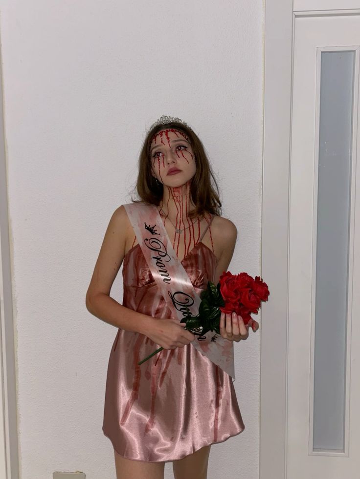 Looking for more costumes inspired by Stephen King inspired horror books? This Carrie costume is iconic and is the perfect excuse to wear fake blood this Halloween while still looking cute.