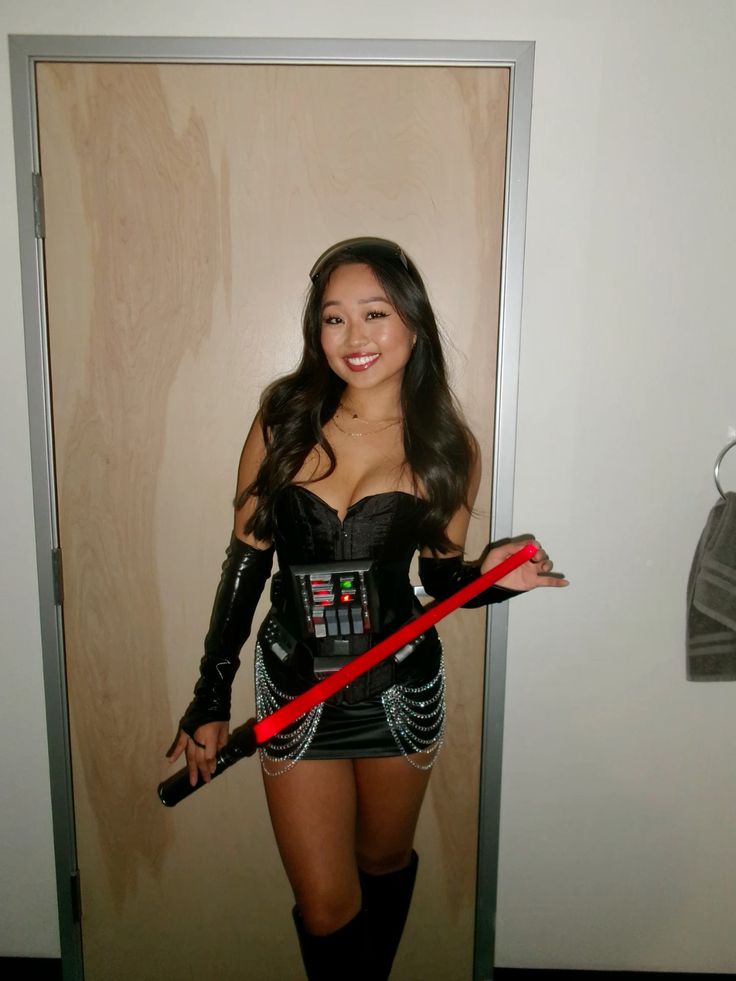 If you're a Star Wars fan, you'll want to copy this sexy Darth Vader Halloween costume. It's a trendy all-black costume, and you can dress up with your best friend for the ultimate matching outfit.