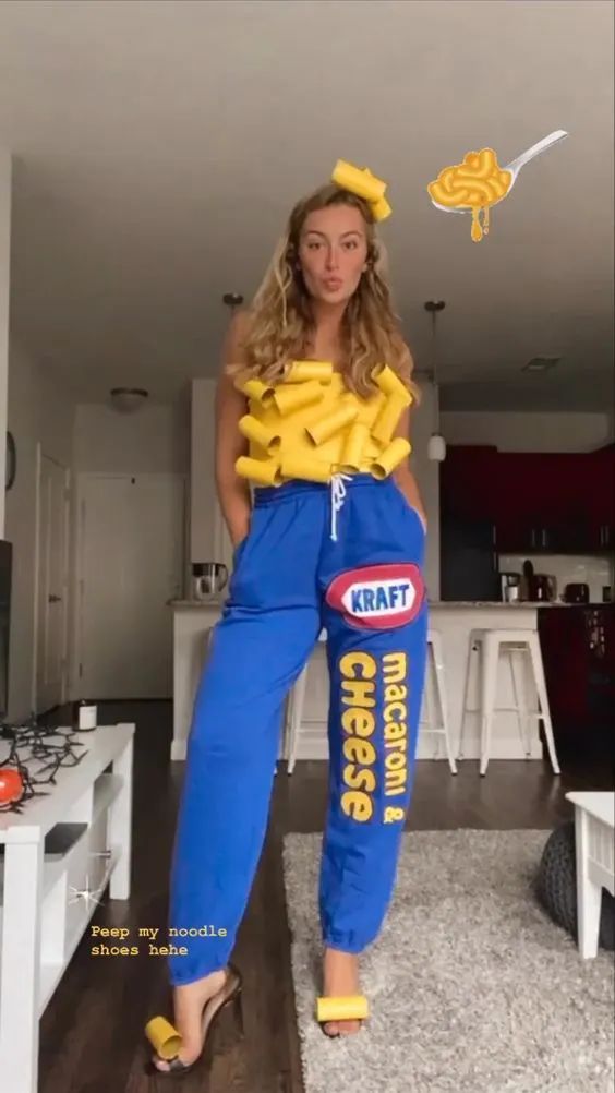 Show off your crafting skills with this cute pasta costume! Get some navy blue clothes or a dress, and recreate this costume with construction paper, and a pasta box for the purse.