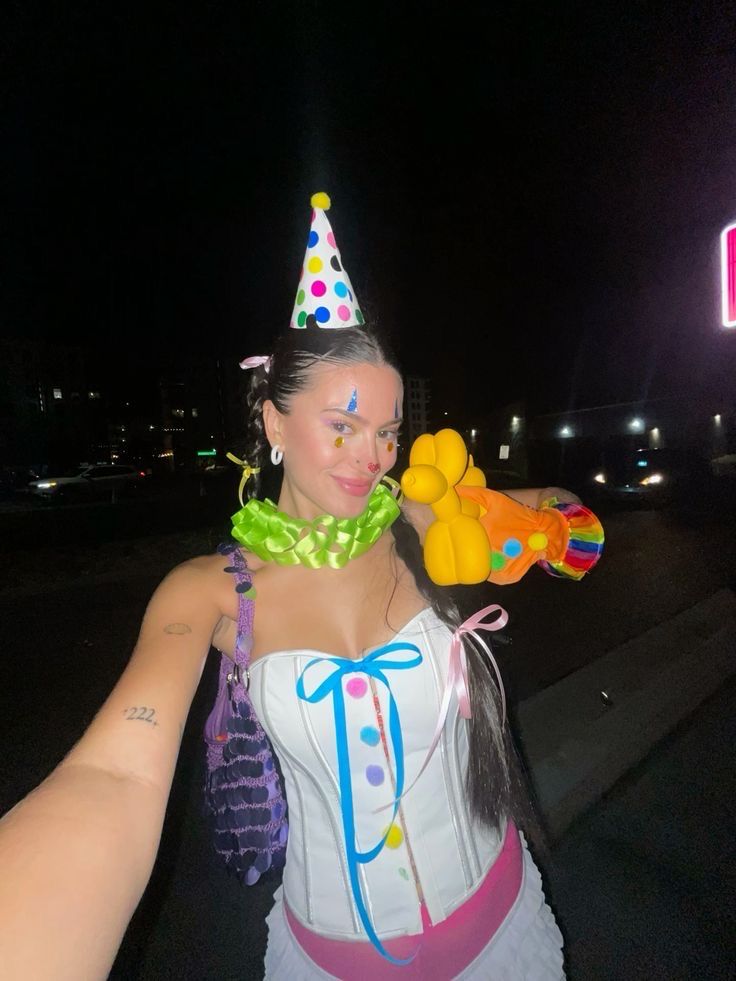 A clown is a classic DIY Halloween costume that you can get creative with while still looking cute. Grab a few party decorations and colourful make up to copy this clown costume idea.