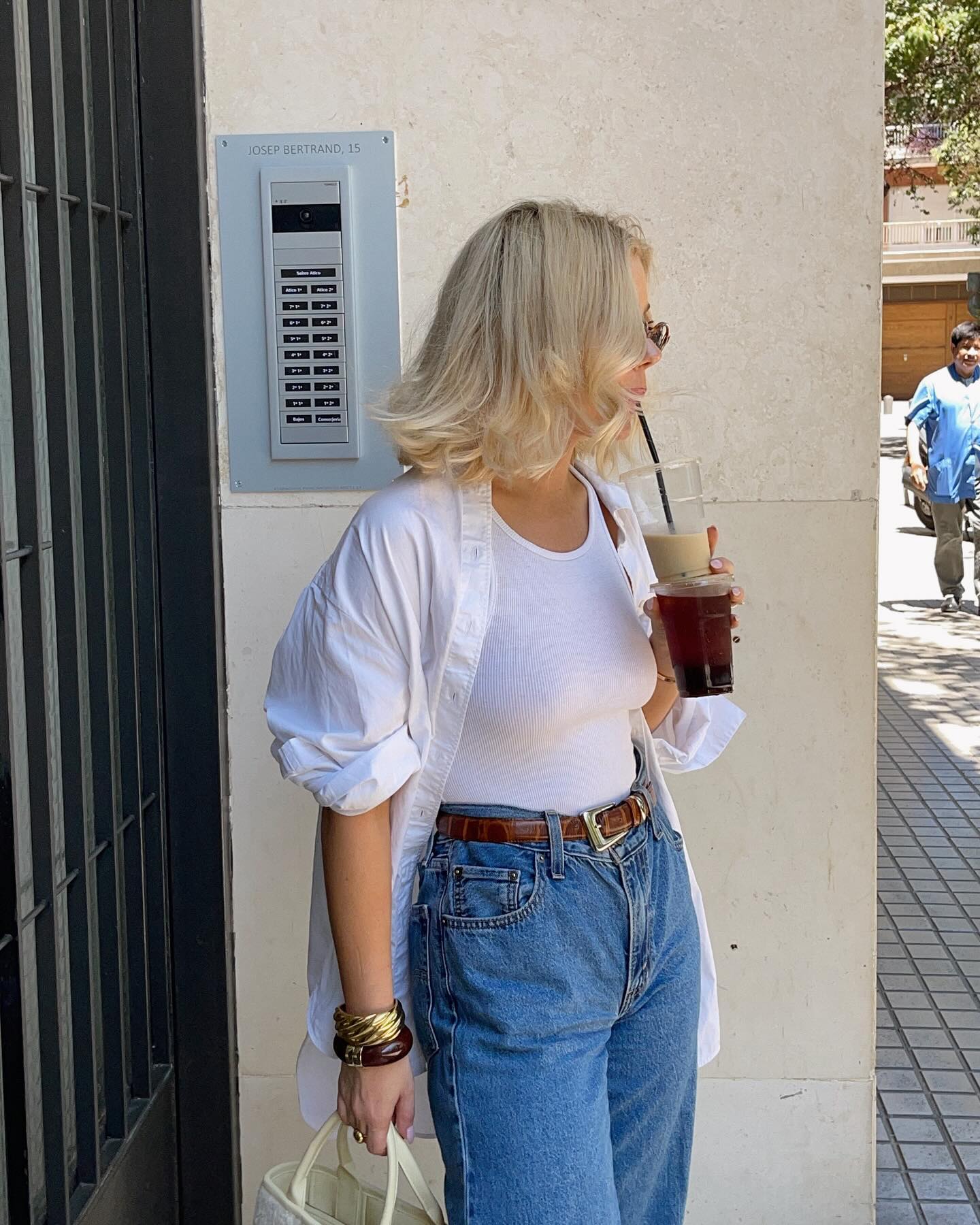 A simple, classic outfit like this is the epitome of fall fashion. Style a white tank top with a pair of denim jeans and top it off with an oversized white button up to recreate this outfit.
