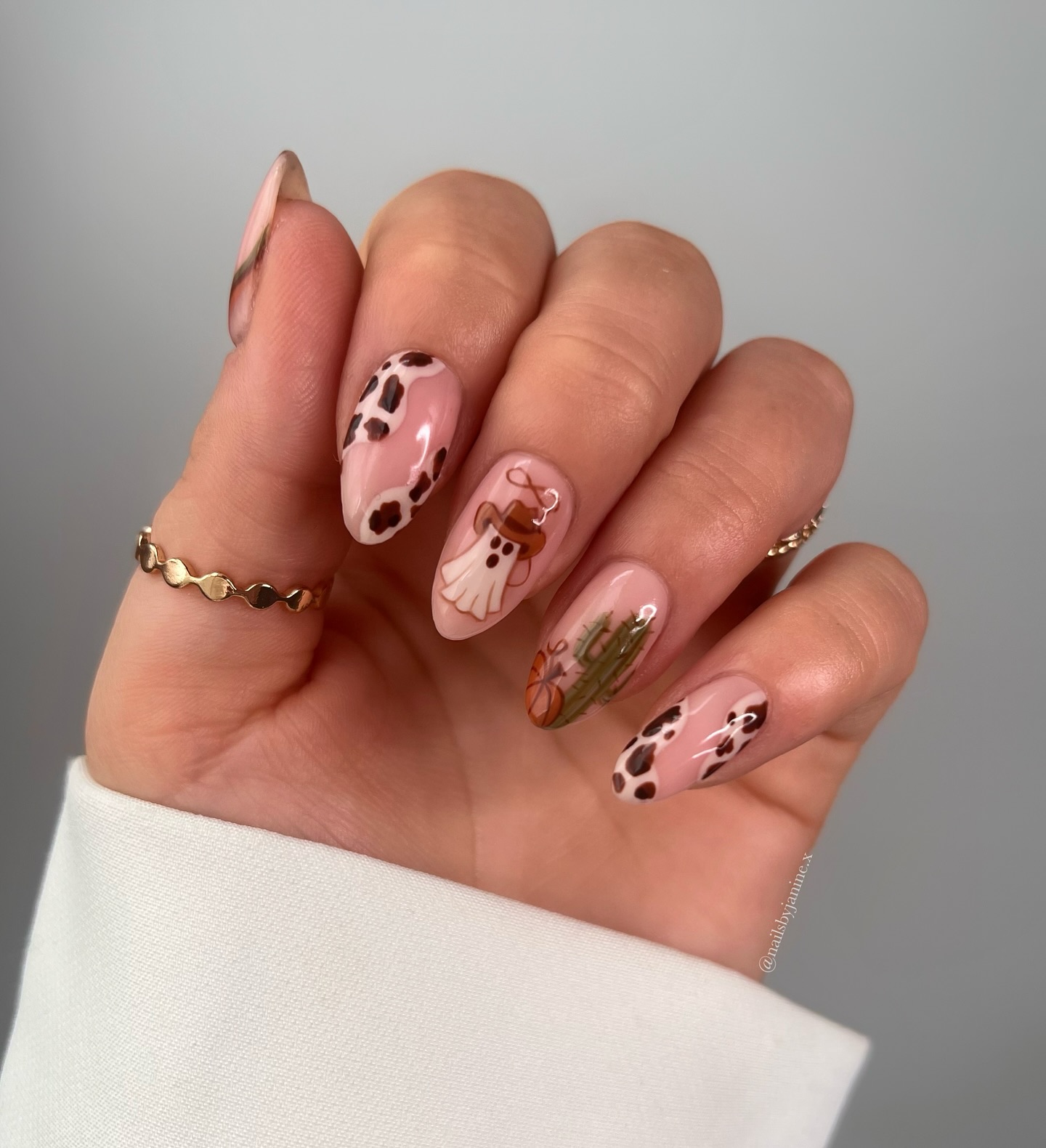 If you love the cowboy aesthetic, you need to try these spooky cowboy nails! The cowprint design and ghost wearing a cowboy hat are so adorable and give these nails such a unique vibe.