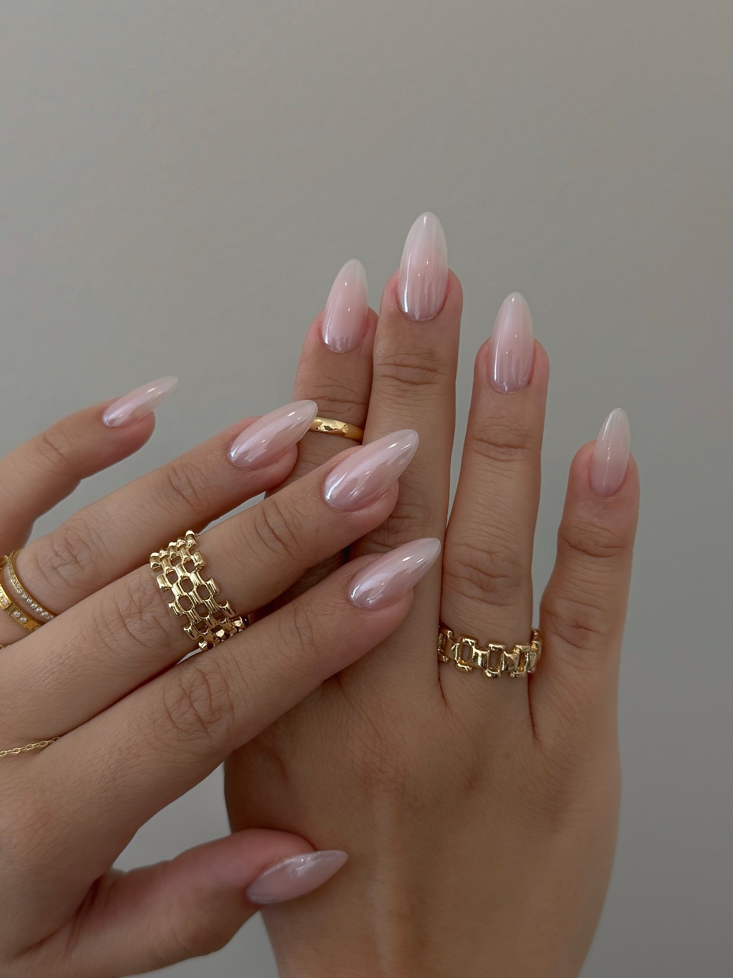 Milky pink and a chrome top coat? Say no more! These beautiful elegant nails will elevate any outfit whether you're off for a night out or out to run daily errands.