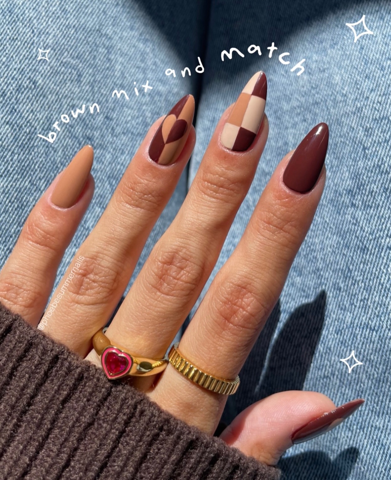 Pop a few accent nails into your set to recreate these gorgeous brown nail designs. The solid colored nails break up the designs to keep your nails stylish without being tacky or overdone.
