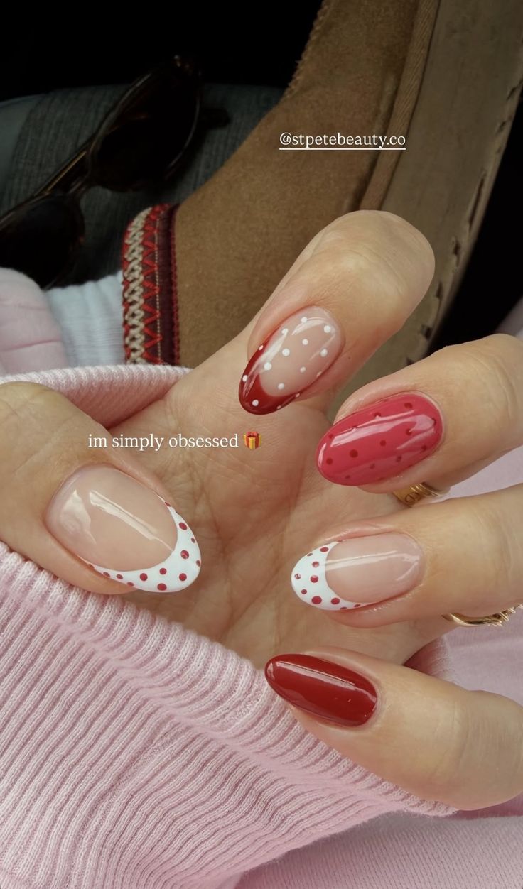 Polka dot nails are trending and they aren't going anywhere soon. How cute are these strawberry inspired nails? Mix and match with red and white to recreate this iconic look.