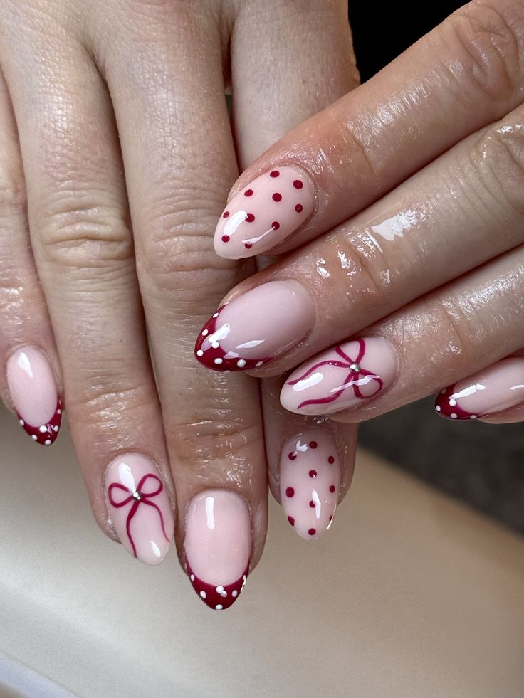 Bring together the two hottest nail designs — polka dots and bows. These dark red nails are simple and will totally elevate your look.